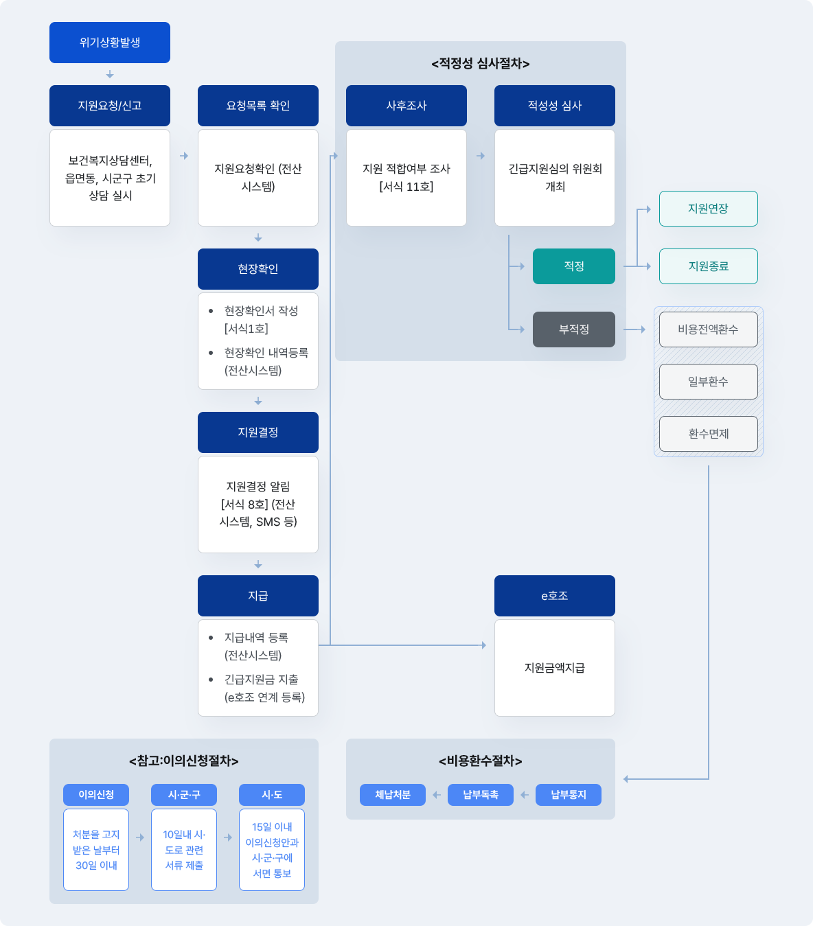 홈 분야별정보 복지 긴급복지지원 절차도 sns 공유하기 리스트 닫기 트위터 페이스북 블로그 링크복사 현재 페이지 프린트하기 기본원칙 체계도 절차도 대상자 종류 및 내용 적정성여부 지원중단 및 비용환수 긴급지원의 절차도 지원절차도 위기상황발생(지원요청 및 신고) 시/군/구/보건복지콜센터(129)/민간협력체계(시/군/구로 연계) 현장확인 지원결정 및 실시 사후조사(1차 지원연장) 적정성심사 1.적정(1.종료 2.지원연장) 2.부적정(1.지원중단 및 비용반환 2.종료) 현장확인 지원결정 및 실시 → 사후조사(1차 지원연장) → 적정성심사(1.적정(1.종료 2.지원연장), 2.부적정(1.지원중단 및 비용반환 2.종료)) 이미지 확대보기